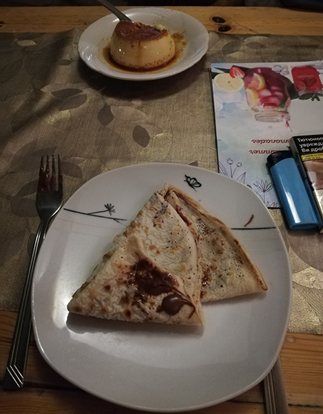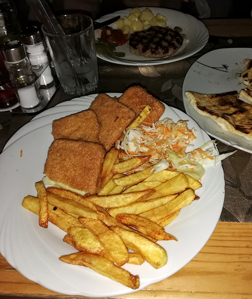 В нашия престой бяха включени закуска и вечеря. Закуската се оказа съвсем простичка: мекички, банички, пържени филийки и, разбира се, обичайното „компле“ – кой ли го е кръстил така? Всичко, обаче, се приготвя на момента (за комплето нищо не мога да кажа – не съм го опитвала, ама май никой не е поръчвал такова) – много вкусно, домашно приготвено.
