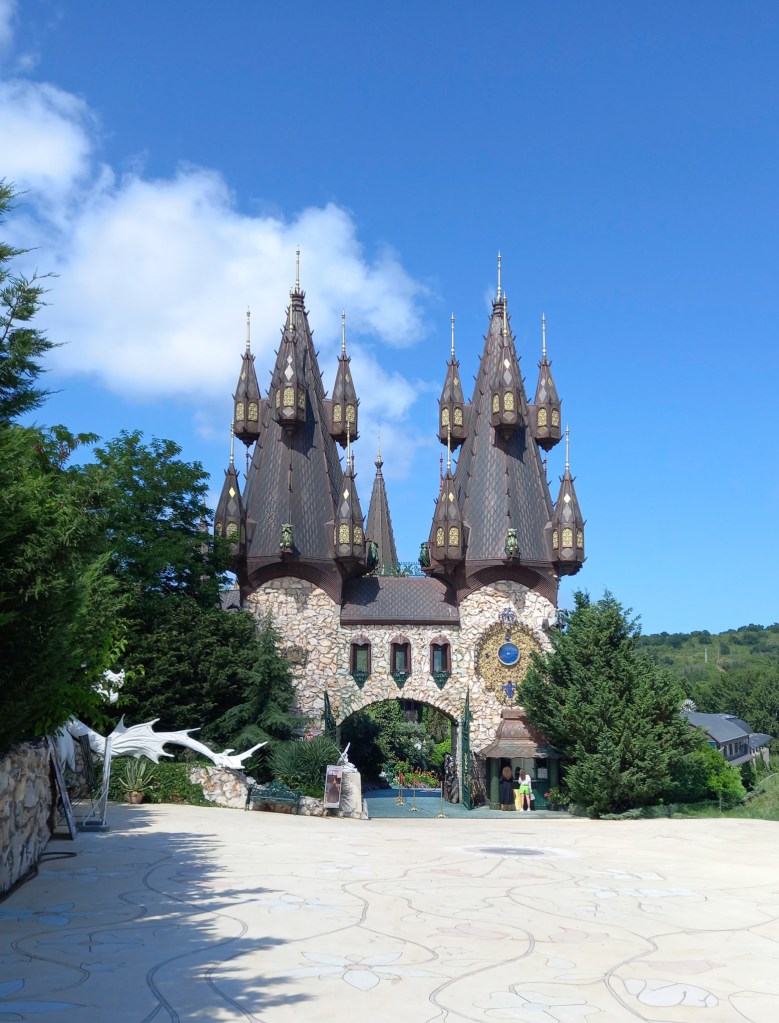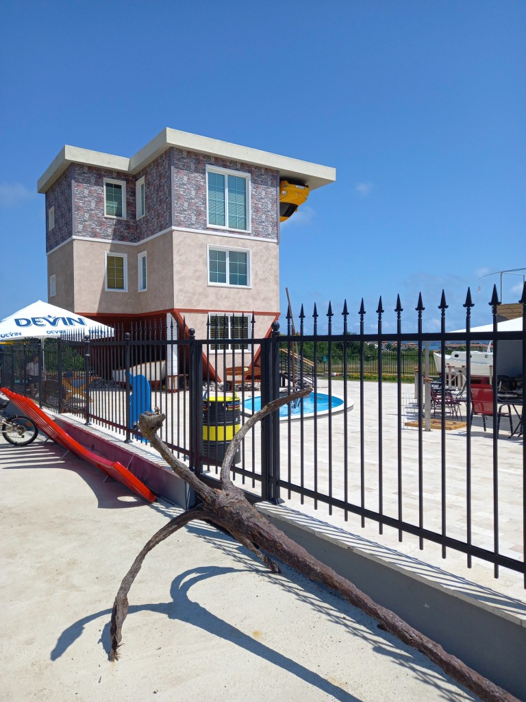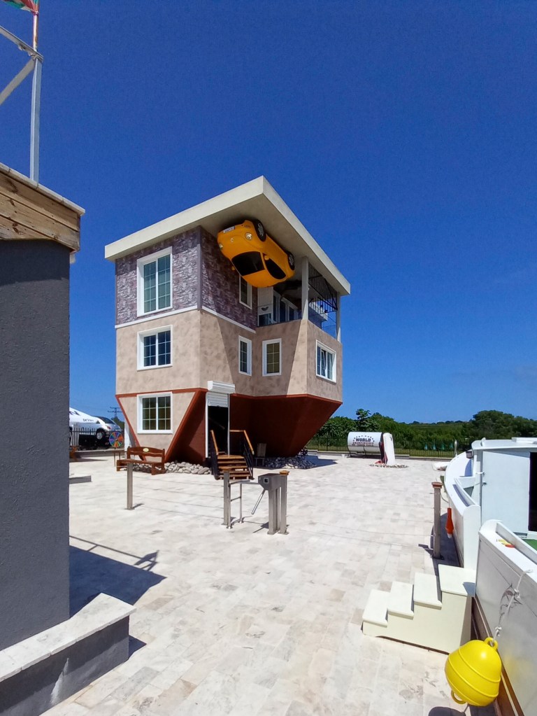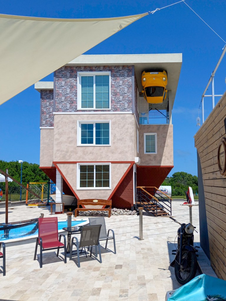 Междувременно, разглеждахме тук-там околните забележителности. Ако потеглим на север, ще стигнем до Обърнатата къща – Обърнатата къща в гр. Черноморец е атракцион, който представлява къща с главата надолу, в която мебелите и интериора са изцяло с главата надолу. Тук само пихме кафе и направихме някоя друга снимка отвън. Входа е 22 лв. на човек – стори ми се, че не си заслужава да дам 44 лв., за да разгледам една къща, макар и да обърната: